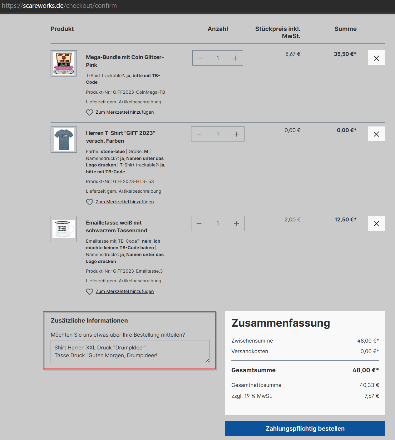 Bestell-Vorganges im Feld Zusatz-Informationen eingegeben