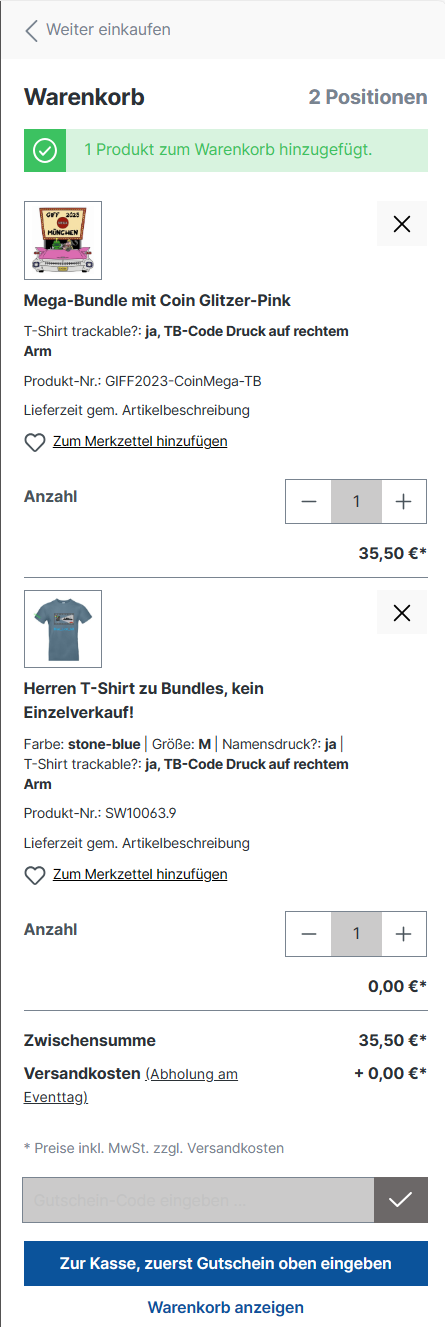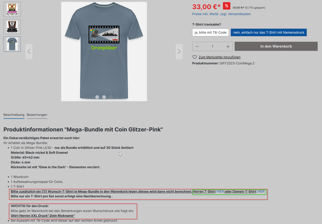 Hinweis beachten, das T-Shirt wird bei den Bundles nicht automatisch hinzugefügt, es muß noch ausgewählt werden ob Frau oder Herr Cacher und welche Farbe es sein soll. Nachdem das Bundle im Warenkorb gelegt wurde, folgt man einem der beiden Links in der Bundle-Beschreibung zu einem T-Shirt, welches dann automatisch 0€ kostet.