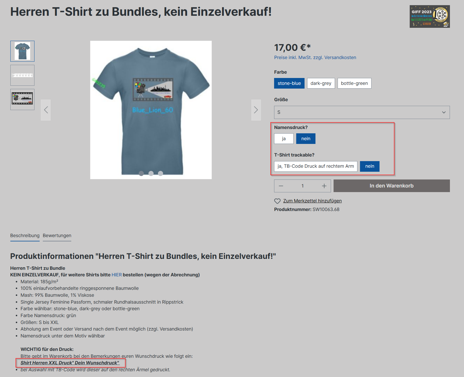 Wenn ihr ein T-Shirt bestellen möchtet, gibt es die Möglichkeit neben den Farben und Größen auch auszuwählen, ob man seinen Nicknamen unter das Logo oder auch zusätzlich einen TB-Code am rechten Ärmel haben möchte. Dafür gibt es entsprechende Schaltflächen.